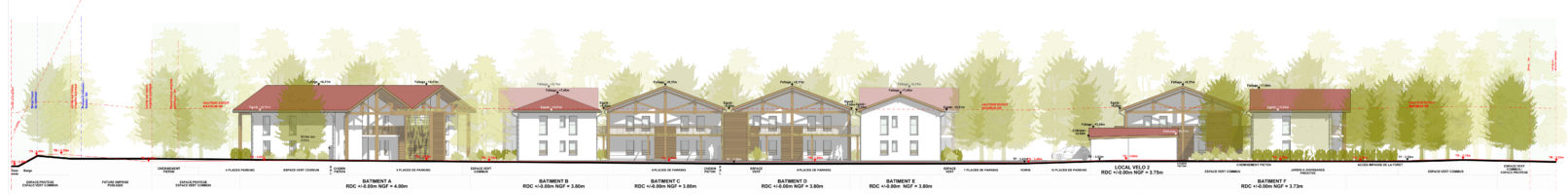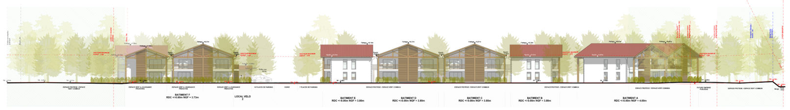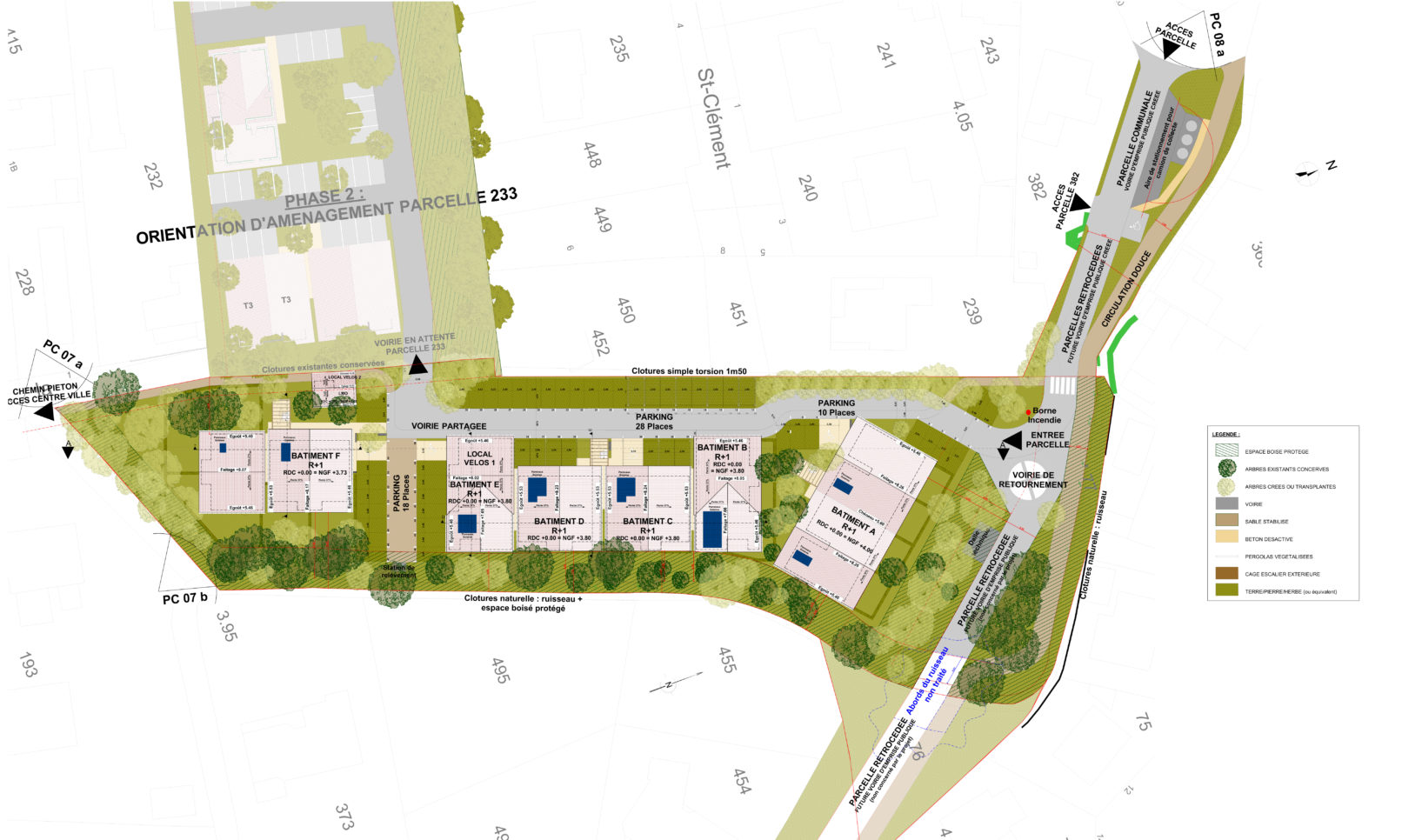 De nombreux arbres existants relevés seront conservés. Pour palier au déboisement obligatoire pour les constructions des bâtiments de nombreux arbres seront plantés dans les futurs espaces boisés protégés et les espaces verts communs ou à jouissances privatives.